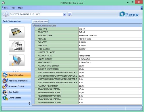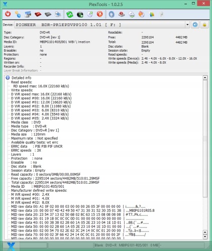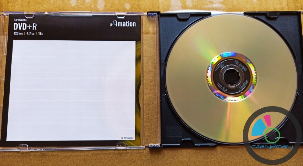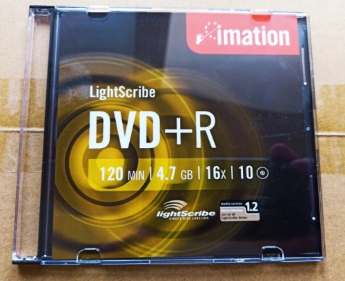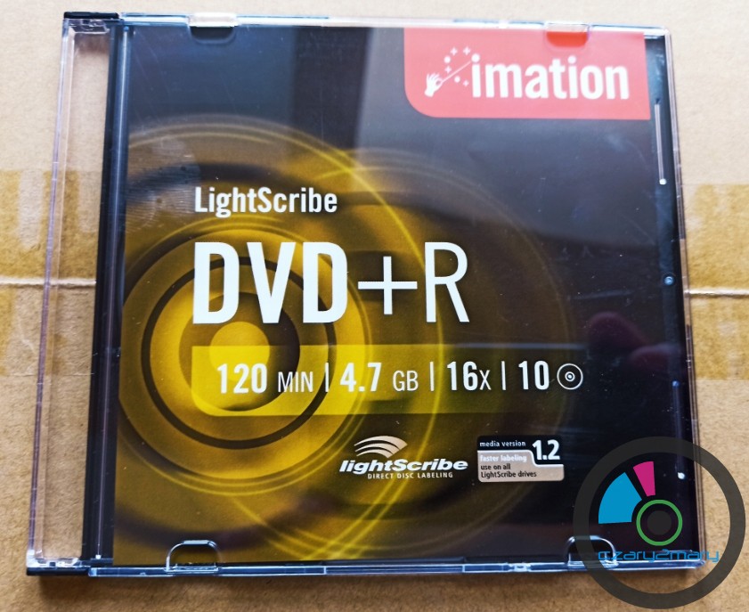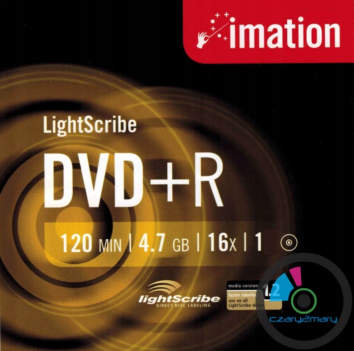 Imation DVD+R LightScribe 1szt. MID: MBIPG101R05 tłocznia Moser Baer Imation- Na dyskach tych można wydrukować etykiety monochromatyczne za pomocą przystosowanych do tego nagrywarek i oprogramowania.Dobra jakościowo płyta do DVD-Video archiwizacja-Nośnik został przetestowany w odczycie i zapisie na profesjonalnym napędzie Teac DV-W5000S JVC Archival Drive (~3000$) i Pioneer BDR-PR1 oraz kilku losowych innych napędach.