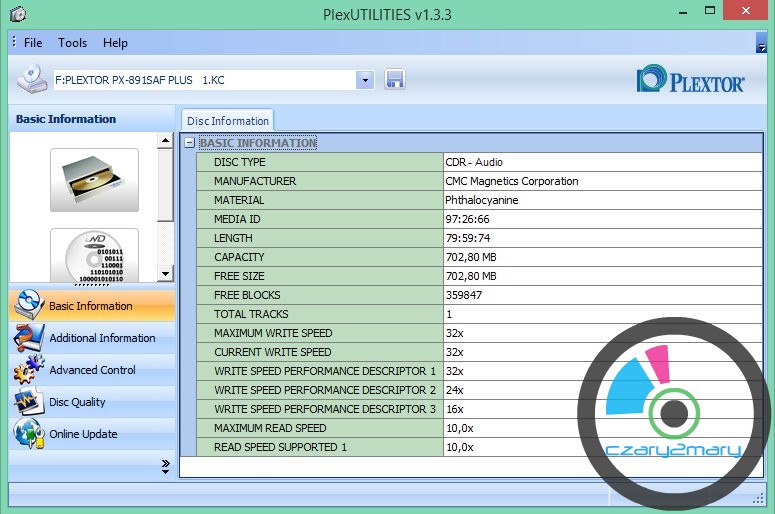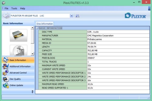 Płyta idealna do zapisu AudioCD na nagrywarkach YamahaPlextor Premium 2 w trybie Audio Master Quality Recording \ Advanced Audio Master Quality Recording
