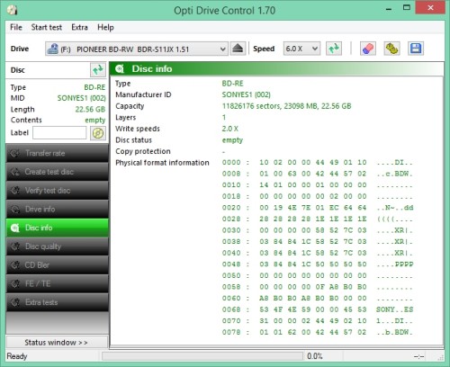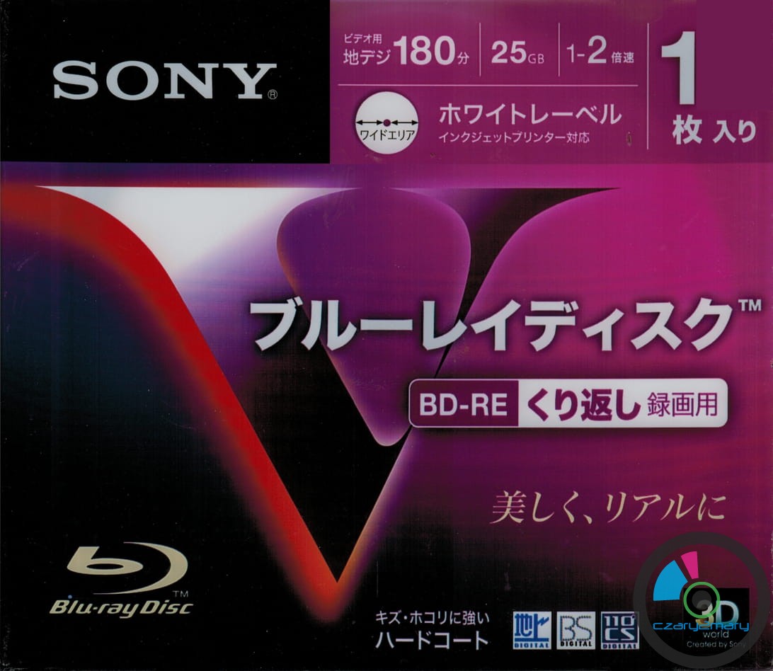 Sony BD-RE Printable x1- x2 - 25GB MID:SONYES1 -nośnik przeznaczony do wielokrotnego zapisu , powierzchnia do nadruku w drukarkach atramentowych - biały matt 22mm-118mm.