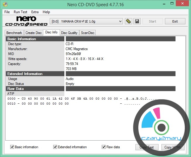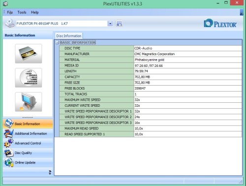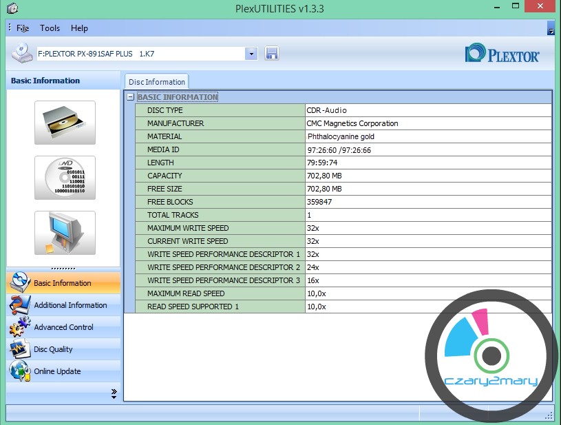 Płyta idealna do zapisu AudioCD na nagrywarkach YamahaPlextor Premium 2 w trybie Audio Master Quality Recording \ Advanced Audio Master Quality Recording